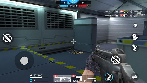 战斗开启后,左边的轮盘负责操控角色的移动,右边的轮盘则用于控制射击、换弹等相关操作。