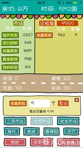 出租屋:这是你的出租屋,从市场采购的货物会存放在这里,点击货物就能卖出,出租屋有容量限制,你可以根据它的容量来囤积货物。