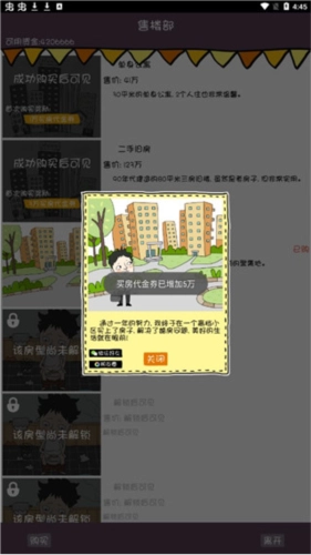 在《买房记》里,玩家除了常规的交易操作外,还可能因各种突发状况遭遇损失或获得额外收益。例如,可能会遇到“路上突然有位大妈扑过来,导致金钱减少10%”的意外;也可能出现“用闲钱购买余额宝,现金增加5%”的幸运情况。