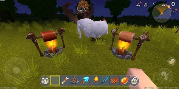 由于野人只在夜间现身,我们得先等夜幕降临,接着把篝火安置在地面,用火炬将其点燃,待篝火燃起后,再把生肉架上去烤制。