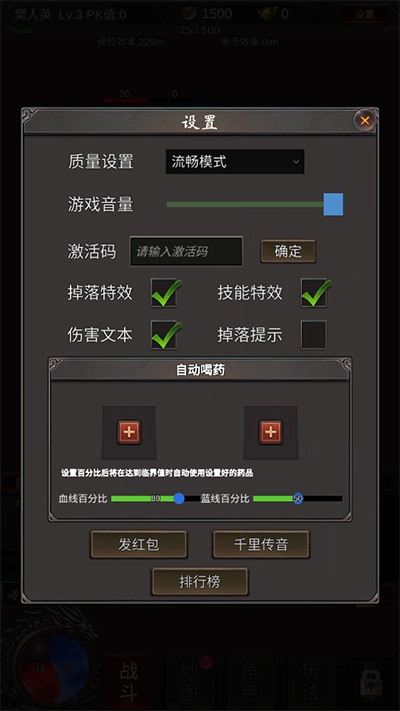 设置界面里可以调整声音和画质,还能开启自动吃药功能,排行榜也在这个界面中。