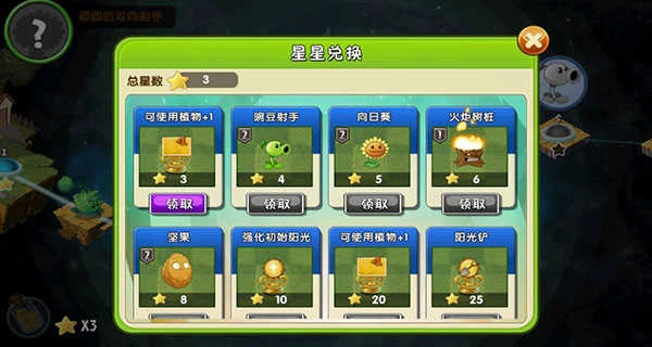 通关关卡能累积星星,当星星数量达到指定要求后,就可以在星系商店里兑换对应的植物或者它的碎片。