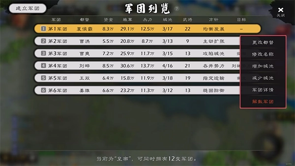 在军团列表里,可进行更换都督、重命名军团、增删所属城池等深度管理操作。