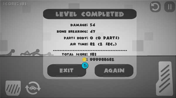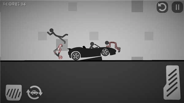 操控的核心由三个动态按钮构成:左侧的按键负责让车辆减速或者倒车,右侧的长条滑块是用来进行持续加速推进的,而带有汽车图标的按钮会触发空中重置功能——也就是让载具和火柴人一同从高处掉落。把这三个按钮交替使用,就可以创造出连续撞击、错位挤压、二次弹射之类的复合伤害效果。