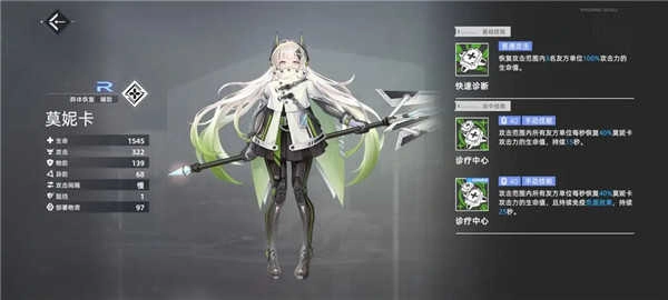 R卡莫妮卡是普通攻击附带治疗效果的类型,不过它的数值比较低,一般练到50级就会被替换下来,除非另外两个SR角色都处于零命的状态。