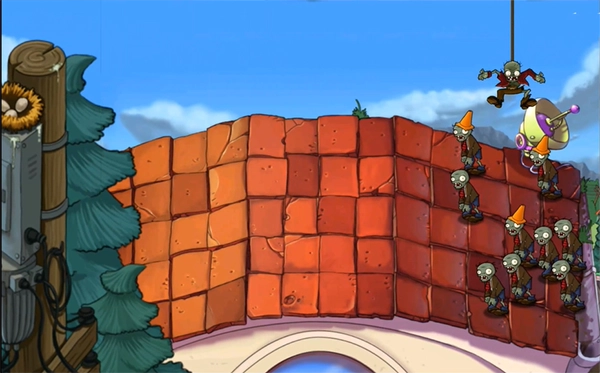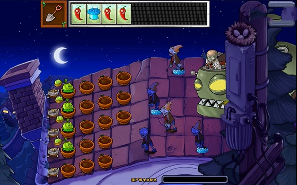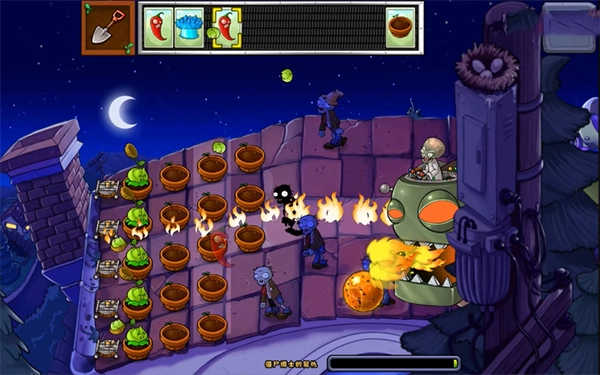 这里的僵尸能够操控大型机器人,还能投放僵尸;植物则是在上方流动的,你得把它们种到这里的盆里,不再是种在一块一块的草坪上了。