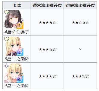主线和塔中大部分都是通常演出关卡,如果有的话一般优先放一张前述的暴击辅助卡,剩下4个位置这里推荐一部分卡作参考,对决演出关卡的推荐参见后面部分。