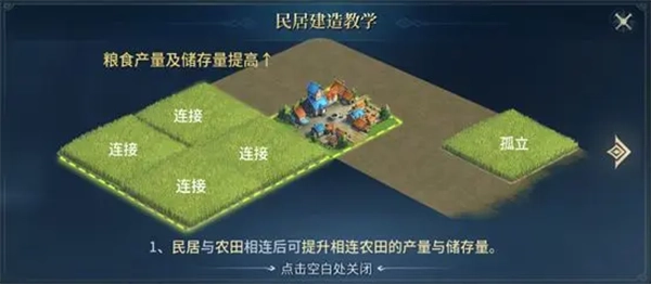 民居:会提供人口增加,在与农田相连后,会管理农田,提升农田的粮食产量并且能够自动收获农田产出的粮食。