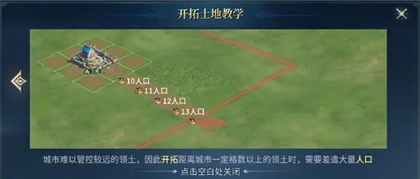 2、玩家开拓土地所需的人口,会随着城市开拓土地数量的提高而增加;在距离城市一定距离之外,需要差遣大量人口。