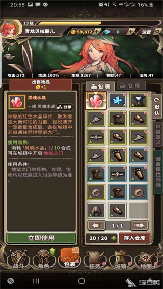 获取的物品可以直接在背包里面查看,对于装备直接点击然后选择穿戴即可。获得金币可以用来学习技能,直接在技能选项中找技能学习即可。
