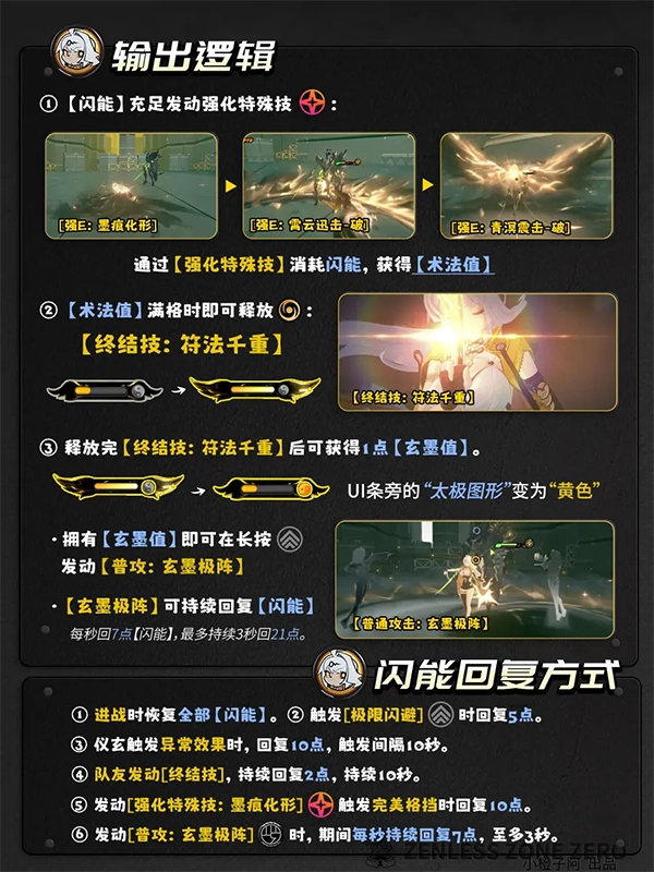 ②术法值满后,释放【终结技:符法千重】获得玄墨值。持有玄墨值时,可释放【普通攻击:玄墨极阵】回复闪能,同时仪玄可以站场继续攻击积攒喧响值。
