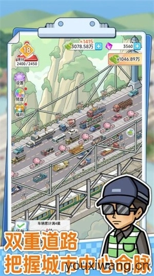 桥梁大亨是一款极具创意与趣味性的模拟经营类手游,玩家将化身桥梁大亨,从零开始打造属于自己的跨江跨河桥梁帝国。相比现实中房东每月收一次房租的平淡无奇,这款游戏让你每天都能坐收滚滚财源——只需静静地守在桥头,看着车辆川流不息,每一次通行都会为你的账户带来丰厚的收益。这种即时的成就感与收入反馈,让玩家在游戏中获得前所未有的爽快体验。
