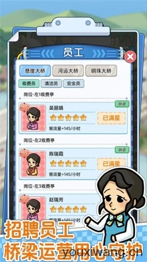 桥梁日常需要维护,老板可以招聘收费员收取过路费,招聘安全员和巡查员日常检测桥梁安全,招聘清洁工保持路面干净,招聘抢险员在里面需要维护的地方进行紧急维护。