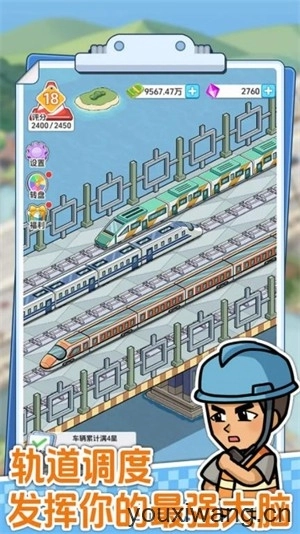 轨道升级包括调度与列车两部分,调度是升级轨道,消耗钞票资源,缩短高速车辆通过一次的时间。列车也需要评分解锁,同样是五个星级。