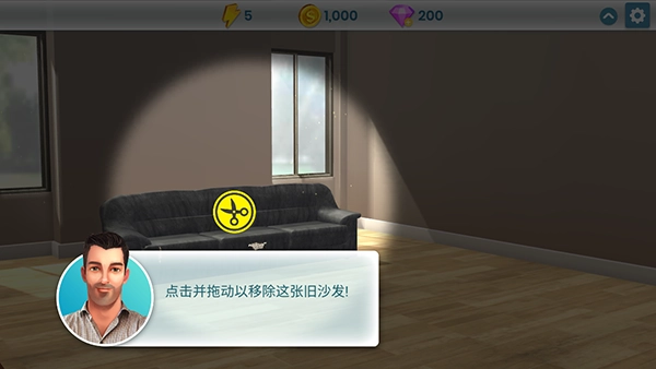 1、进入游戏后,会有一段新手指引,点击这个剪刀的图标便可以对沙发进行改造;