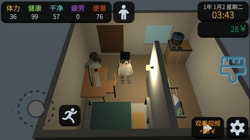 8、当啷啷当!萝卜温馨的小家终于布置好了!不过这个小平房是真的小,客厅的位置放上一个单人床基本就占满了整个空间了,不过萝卜还是在边角安排上了几件功能性家具,如灶台、电脑、马桶、洗手池等等,这些家具基本上也满足了恢复五个状态值的需要。