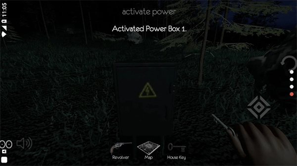 左上角的三角形就是我们当前所在的位置,然后我们可以看到地图上有四个红点,这四个红点是电力机器,将他们打开之后,需要去到地图上的闪电标志的位置开启大电箱(黄色的),接着就是找hunter'key,然后找到小木屋,开了门之后可以看到桌子上有两个东西: