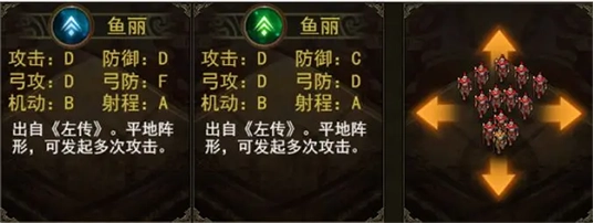 鱼丽阵:姜维智力96,因此鱼丽阵,作为姜维的前期智力型武将玩法首选阵。能将目标打成“疲兵”状态,可以算做是姜维的主力阵形。