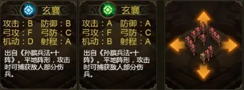 阵形: 锥形阵(1阶)、偃月阵(1阶)、鹤翼阵(1阶)、鱼丽阵(1阶)