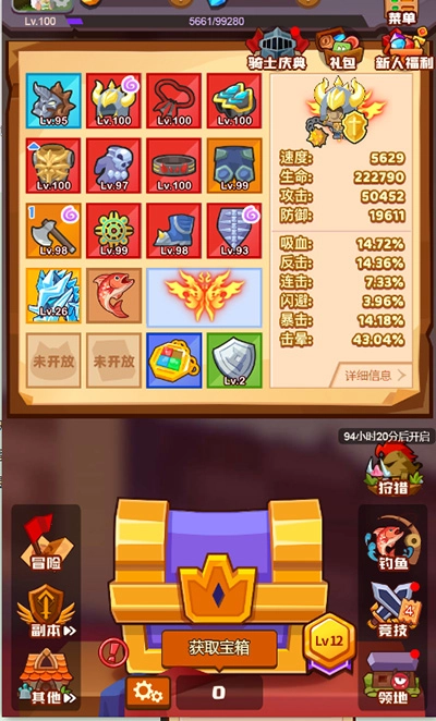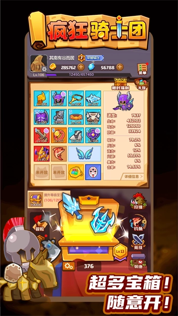 1、疯狂骑士团最核心的部分就是开宝箱获取装备提升战斗力,所以关于宝箱我们只要一有就开,100级的前面主要是为了获取经验升级,不到100级的装备更新换代会非常的快。