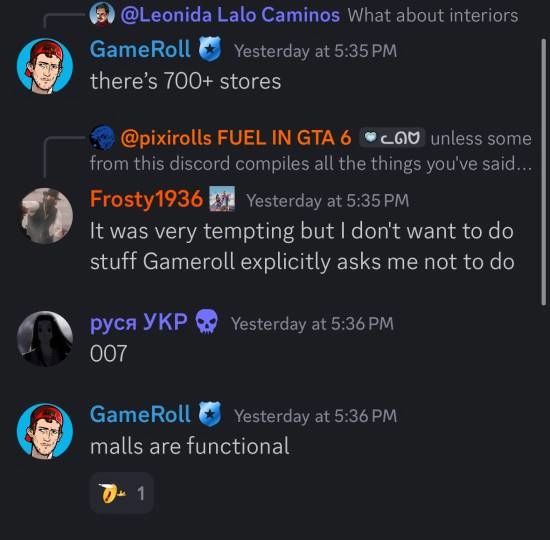 而关于《GTA6》可进入建筑的数量的传闻,GameRoll称虽然入室盗窃功能被取消,但游戏仍有超多可抢劫的商店(包括大型商场)。在Reddit论坛里,GameRoll补充说到:“我不确定消息来源所说的商店指的是什么。我知道商场是可以进入的,但就像泄密视频里那样,有一些片段说可以从口香糖贩卖机买东西。如果所有可以买东西的地方都定义为‘商店’,那700家就不会让我感到惊讶了”