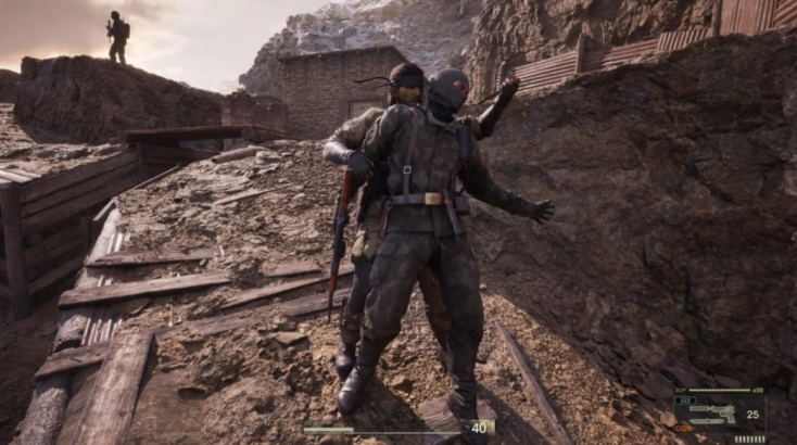 装备动物迷彩+沙漠油彩+AT伪装蹲行可以达到90%伪装率,能够快速通过并且仅清除主路上的敌人。可以在第一个区域中间的岩缝中补充Mk22弹药。