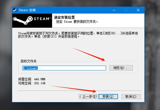 点击浏览,更改steam安装目录,避免将steam安装至盘或者是有中文路径的文件夹,防止后续使用出现报错。