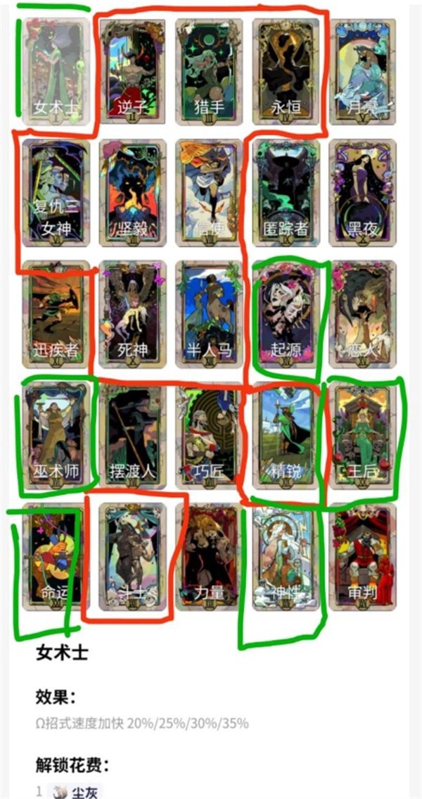 红框卡牌为必选(核心增益与减伤),绿色为可选(提升续航或增幅法阵范围)。优先选择与法阵伤害或控制相关的牌。