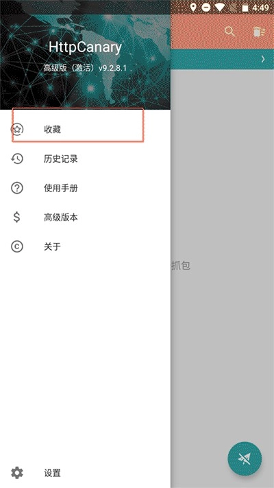 点击抓包首页左上角的三条杠,收藏的包可以在这里查看