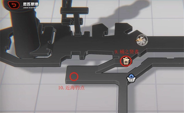路线说明:出生点后转,下楼梯前往水边钓鱼区域。