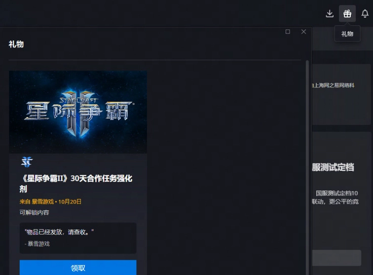 此外,为了庆祝国服回归,我们也为玩家们赠送了30天合作任务强化剂。只要在2025年10月21日后首次登录国服《星际争霸II》,在稍等片刻后,点击【战网桌面应用】玩家头像左侧的“礼物”按钮,即可领取强化剂奖励。