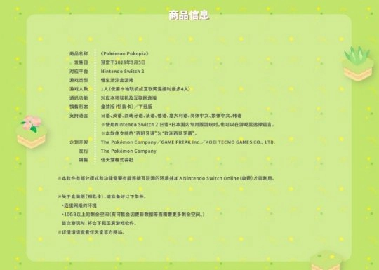 近日,任天堂官宣,一款由光荣特库摩旗下Omega Force工作室打造的全新生活模拟游戏《宝可梦:Pokopia》,将于2026年3月5日在Nintendo Switch 2平台上线。该作品是任天堂发行的首个采用“游戏钥匙卡”格式的游戏,体现了公司在实体与数字发行模式方面的全新探索。官方明确表示,游戏的最新预告片将于11月13日发布。