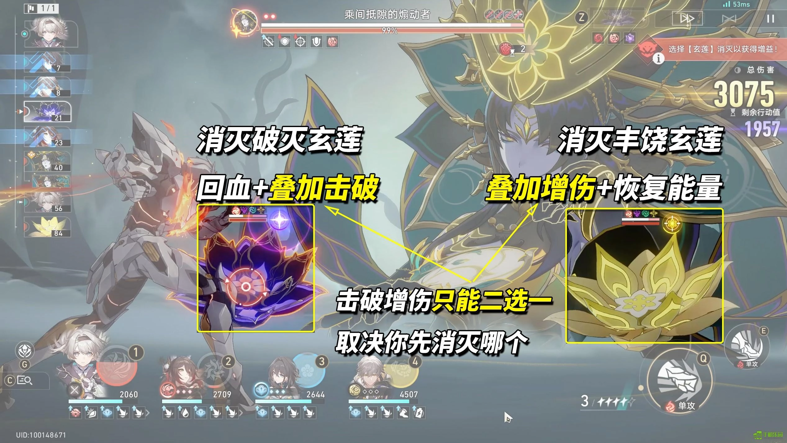 在对局过程中,若成功消灭左侧的破灭玄莲,角色能够恢复血量,同时叠加击破效果;而消灭右侧的丰饶玄莲,则可恢复能量,并叠加增伤效果。需要特别留意的是,击破与增伤这两种效果只能获取其一,具体获得哪种效果取决于你最先消灭的玄莲属于哪种类型。