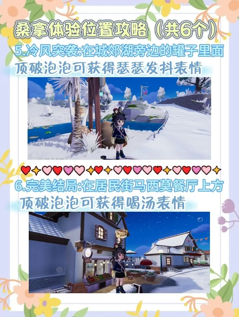 在心动小镇举办的沸雪浴场庆典中,桑拿体验环节里藏着六个隐藏气泡,正待玩家前来探索。这些隐藏气泡分别位于渔村广场、温泉山、紫光沙滩等不同场景的特定位置。倘若玩家能够将这些气泡尽数收集,便可解锁一套完整的桑拿主题表情包,为你的小镇生活增添更多趣味互动形式。