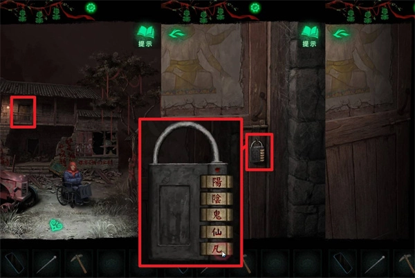 2、根据【阳、阴、鬼、仙、凡】顺序解锁密码,进入房间。