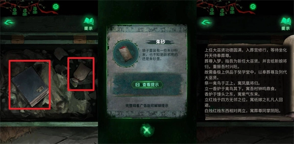 1、在桌子按提示放置物品及毛笔顺序,解开谜题。