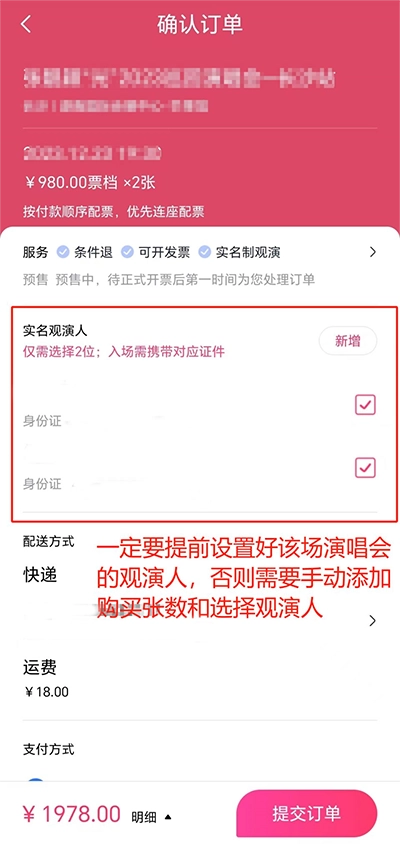 抢票前可以提早找个其他有票的演唱会进行演练一遍,只要最后不支付就没关系。抢票时要确保自己都已经设置好观演人和收货地址,注意实名观演人需打勾,配送地址是选好的,支付方式确认一下即可。