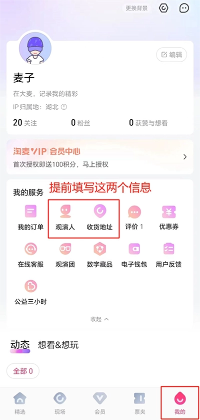 1、下载大麦APP,进入大麦APP首页,点击右下角“我的”,提前填写“观演人”、“收货地址”这两块信息