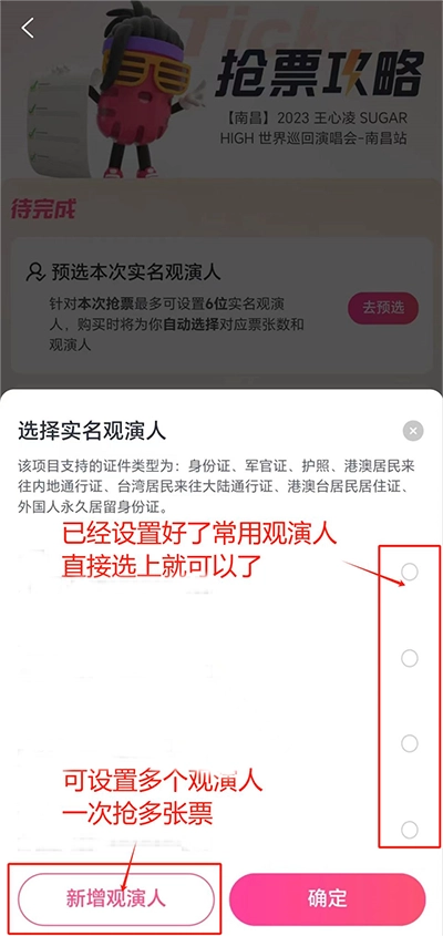 1、在演唱会开票前点击"添加日历提醒"和“抢票攻略”的提示,进入“抢票攻略”这个提示,提前选好观演人。可设置多个观演人,同一个订单优先连座。(一个订单可抢多人门票,提前设置多个观演人,可以购买多人连座门票)