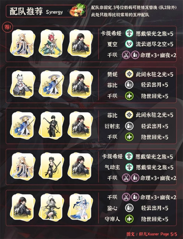 注意:卡提希娅夏空队的千咲不适合使用“轻云出月”五件套,因为卡提希娅不吃攻击加成。