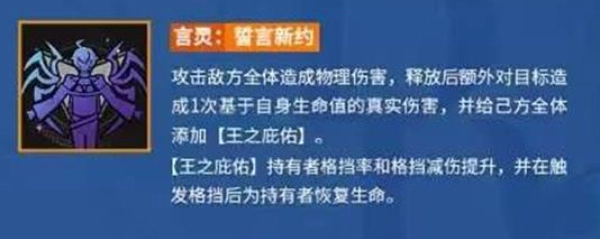 团队增益:全队挂【王之庇佑】,提升格挡率与格挡减伤,格挡后回血。