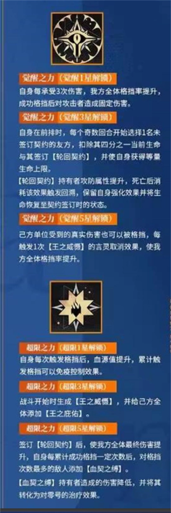 5星:可格挡真实伤害,触发王之威慑后全队格挡率再提升。