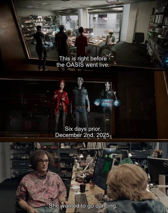 根据影片当中的剧情,绿洲于2025年12月8日正式上线,并逐渐从一个简单的在线游戏平台发展成一个在全球都拥有大量用户的网络虚拟世界。
