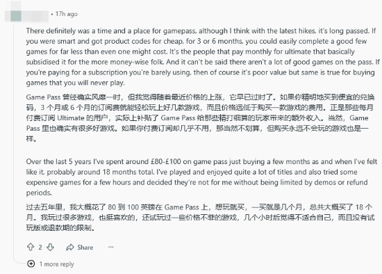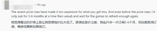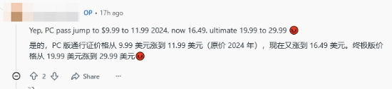 发帖人也在下面的评论当中补充了另一个让他对XGP产生不满的原因:涨价。一些玩家也表示了类似的观点:
