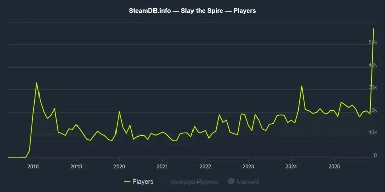 在正式发售近七年之际,卡牌肉鸽类游戏《杀戮尖塔》于Steam平台的同时在线玩家数刷新了历史纪录。这一现象的出现,一方面得益于平台冬季促销活动带来的游戏折扣优惠,另一方面或许也与社交媒体上频繁传播的“战未来”“机宝”等《杀戮尖塔》相关玩梗有关。