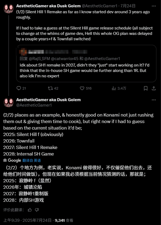 不久之后,知名爆料人Dusk Golem在推特发文透露,这款重制版游戏“大约三年前就开始开发了”,并且2027年已为《寂静岭》初代的重制版预留。