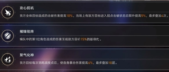 1当BOSS进入弱点击破状态时,敌方将解除所有减伤效果,行动进度被延后,同时获得100%的易伤状态;我方全体则会解除控制效果,立即执行一次行动,并恢复战技点。建议搭配部分进攻型辅助角色,助力快速削减敌方韧性条,成功击破BOSS后还能额外补充战技点。