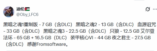 而FromSoftware的粉丝玩家@Oby_LFC6转发该帖表示,还好他关注的几款游戏大小相对比较合理,并顺带整理出了多款游戏的文件大小。看到这些数据,再跟@WyattzWorId吐槽的这些100GB的游戏作品相比,显然更精巧。