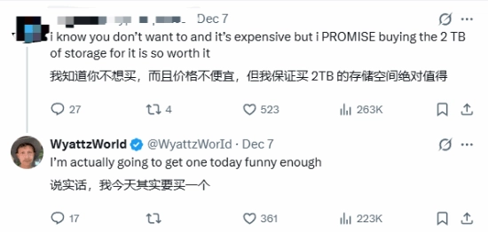 内容创作领域的玩家@WyattzWorId在个人推特上发文,吐槽了当下游戏安装包体积过大的现象:“讲真,这事儿挺让人不舒服的。现在这个年代,500GB的存储空间居然只能装下4个游戏。”