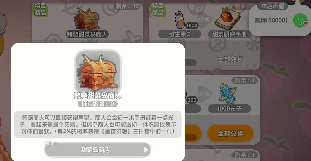 提升三个资源岛的“声望”至“崇拜”是兑换碎片的前提,也是最易被忽略的难点。每日务必在糖、木、石商店用VC、VD、VA货币购买5本“手册”,这是声望的主要来源。仅靠购买手册无法达到50000崇拜声望,必须额外通过“贿赂商人”或提交B5/B6/B3维生素兑换“感受体”来补足,前者速度远快于后者。